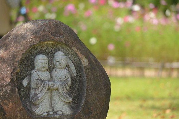 里山や秋の風景には、道祖神が似合います。望遠レンズのボケを使って、季節感の出るように、背景に少しコスモスの花を配しています。絞りを加減して、コスモスの見え具合を変化させます。