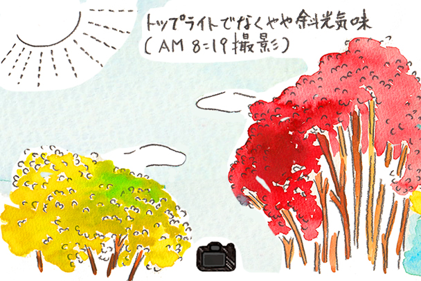 - 赤と黄の紅葉の分量をどうするか何枚か撮ってみて判断