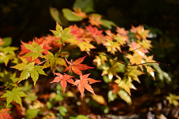 雨上がり、背景が暗くなるようなところにある紅葉を選んで、順光で撮影しました。水分が残っているため、色の具合も変化しています。暗めの背景ですから露出をマイナス補正して撮りました。