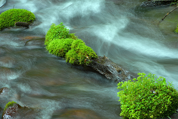 緑陰の流れに苔のついた倒木がありました。水の冷たさが感じられるようにホワイトバランスをK(色温度設定)で4760Kにし、青みを加えています。3つの苔を対角線上に並べてやや高いカメラ位置から見下ろしています。シャッタースピードは1秒で撮影しました。