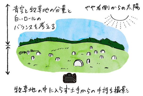 - 快晴の青空、白いロール、緑の草原の3色のバランスを考える