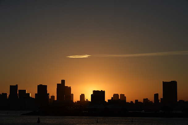 街の夕景の中、ビル群の四角いシルエットが美しい一枚。夕焼けの橙色の中で、直線とデコボコが街の混沌さを象徴しているようにも見えてきます。ワンポイントの一片の雲がよい感じです。