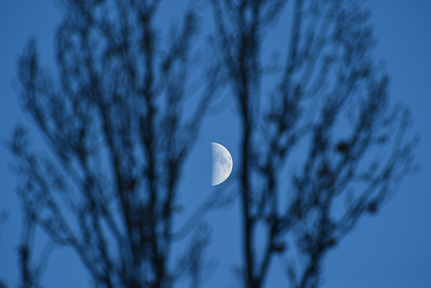 前景の木々のシルエットに挟まれたような月が、まるで人為的に貼り付けたように思えます。レンズにテレコンバーターAF-S TELECONVERTER TC-20E IIIをつけ400mmにして月を大きく撮りました。色温度を調節(4700K)してやや青味を増しています。