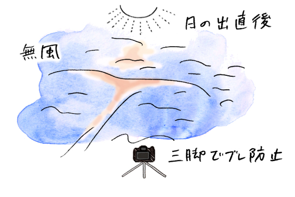 日の出直後の、風が無いタイミングを狙っての撮影。低い位置から雪面に近づき、三脚を使用してブレないよう注意しながら撮りました。