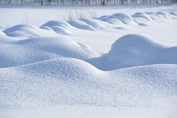 除雪した後とみられる畑の畔のような所に、やわらかい曲線のポコポコとした盛り上がりが並んでいました。望遠ズーム(AF-S NIKKOR 80-400mm f/4.5-5.6G ED VR)で道路から引きつけて、ちょっとユーモラスな形を大きくとらえてみました。