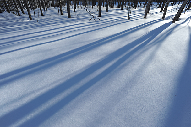 雪面そのものの形ではないのですが立木の影の直線が美しく、踏み跡のないきれいな雪面に夕方の低い太陽が長いシルエットを見せてくれました。超広角(17mm)で広く遠近感を誇張して撮影してみました。