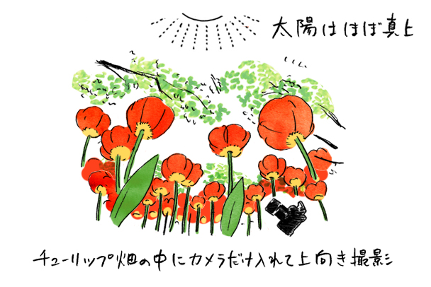 太陽がほぼ真上にある時間帯に、チューリップ畑の中にカメラを入れて上向きに撮影しました。