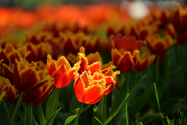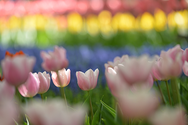 望遠レンズで被写体の前と後ろにボケを演出し、中央のピントを合わせた一輪を浮き上がらせます。色の異なるチューリップの花々は春の日差しの中でワイワイ騒いでいる小さな子供たちのような印象でした。