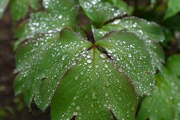 ボタンの葉の曲がり具合は、葉そのものの重さのせいか、はたまた水滴の重さのせいでしょうか。この曲がった様子が、光った水滴と光らない水滴のコラボレーションを面白く演出しています。