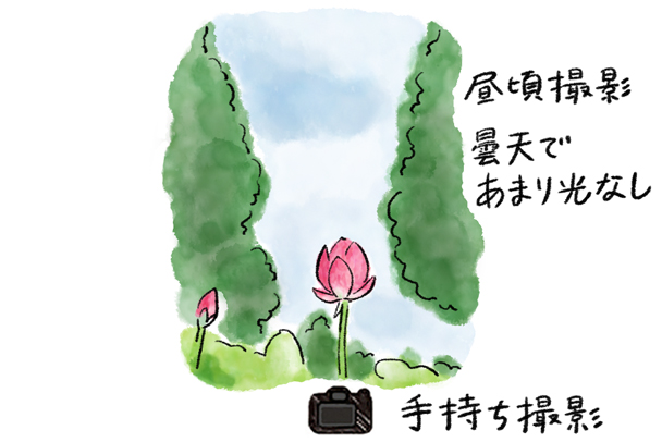 曇天の日の昼下がり、あまり光のない状況下でカメラを手持ちして撮影しました。