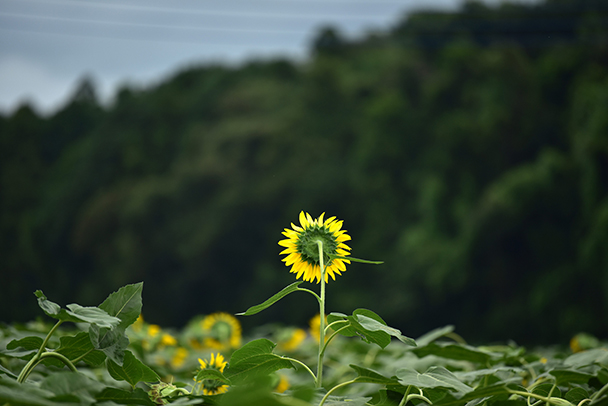 背景はやや暗めの木々。その前に1本だけ飛び出たようなヒマワリが咲いていました。普通花芯が見えるように正面から撮りますが、後ろ姿のガクのギザギザもまた画になります。マイナス(-1.0)の露出補正です。