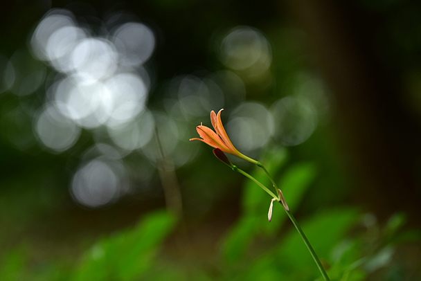 緑陰にひっそりと咲いていたキツネノカミソリです。カメラの位置をいろいろ動かして、背景に木々の隙間から丸ボケが入るようにし変化をつけてみました。
