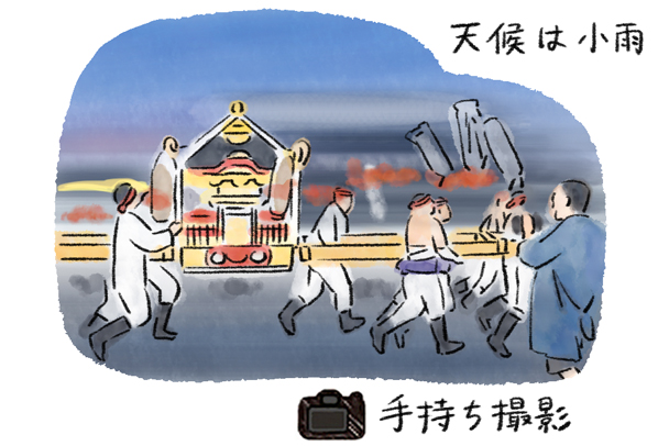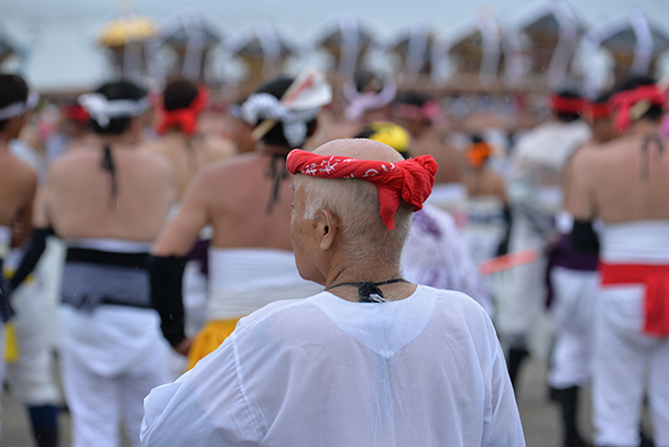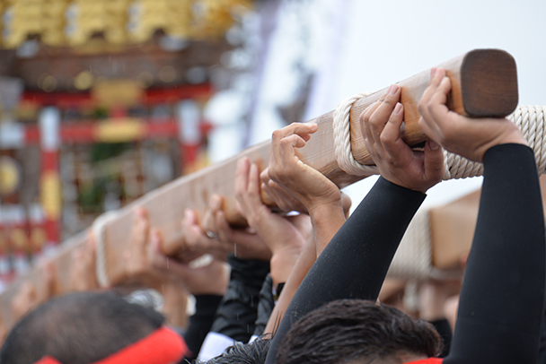 山車を持ち上げる「さし」の瞬間を、望遠レンズの360mmで切り取ってみました。レンズの焦点距離を変えることで、足元、顔、手などの部分から祭りを想像させる撮り方が可能です。
