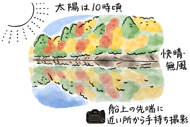 人造のダム湖で朝一番の渡し船に乗り、出会えたのは静寂の水面。無風の水面の写り込みにワクワクしました。快晴の天候も味方してくれています。太陽が10時の位置にあるタイミングに、船上の先端に近いところから手持ちで撮影しました。