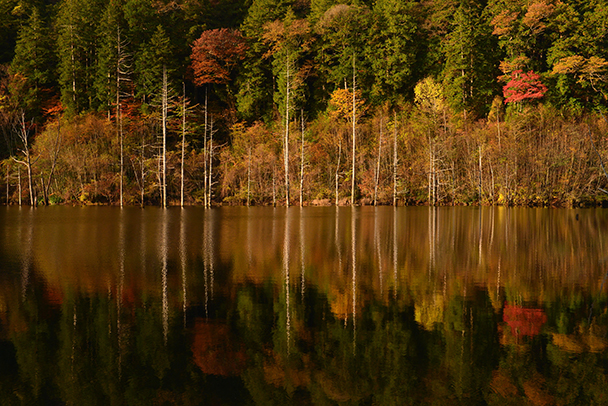色づく葉と水を絡めてみると、一味違った秋の風景になります。できるだけ風のない日を選んで、写り込みを大いに利用してみましょう。