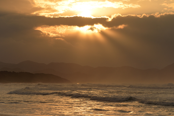 海を見下ろす高台で三脚を構え、夕景を狙っていました。雲が多く半ば諦めていたのですが、突然雲間から色つきの夕日が差しはじめました。まさにシャッターチャンスです。