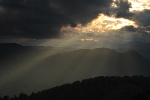 山上で出会った光芒です。晴天の夕焼けもきれいですが雲間からの一条の光もよく、画面の対角線に入れました。光の強調をするため、低め(-1.3)に露出補正をしています。