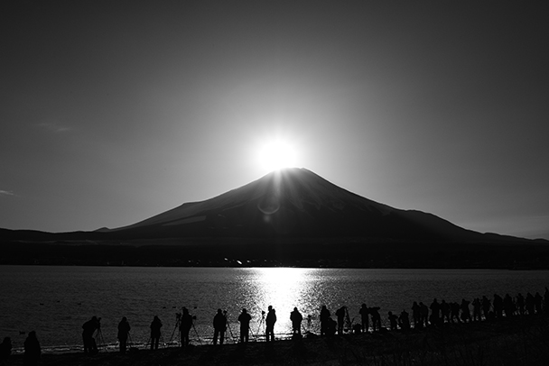 シャッターチャンスを待つ人々を手前に入れ、自然の大きさや雄大さ、画面の奥行き感を表現しました。モノクロで撮り、夕焼けの赤を消しています。