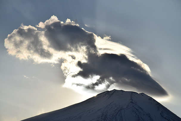 皮肉にも山頂の所にのみ変な雲が発生していました。自然相手ではなかなか思いのままにはなりません。ダイヤモンド富士ではないものの、雲の形と光り具合が一味違う作品に仕上がりました。