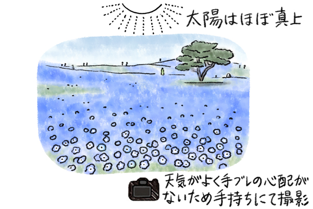 太陽がほぼ真上にある時間帯で、天気がとてもよく手ブレの心配がなかったのでカメラは手持ちで撮影しています。