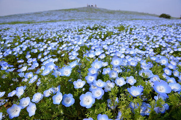 丘一面に咲きそろったネモフィラ畑です。斜面の広がり感を表現するために標準ズームレンズの広角側でできるだけ多くの花々を写し込みました。花畑の広大さを強調する要素として見学者と木を配して広さと大きさの対比を考えました。