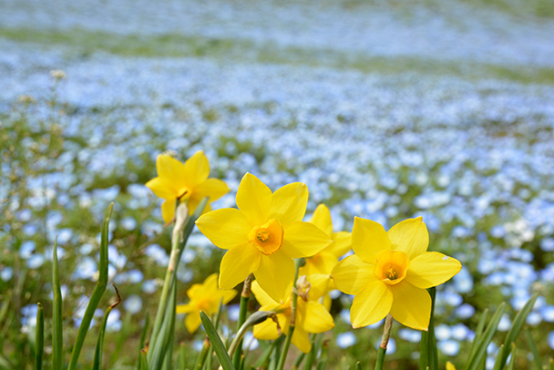 少しレンズの焦点距離を長めにして手前の水仙に近づき、背景に脇役としてぼかしたネモフィラの青を入れ色の対比を狙いました。主役を変更したバリエーションです。