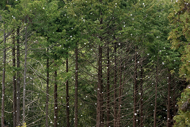背景が暗い杉林だったのでより花弁の白が見えやすくなってくれました。早いシャッタースピード(1/500秒)で花弁の舞い散る動きを止めています。