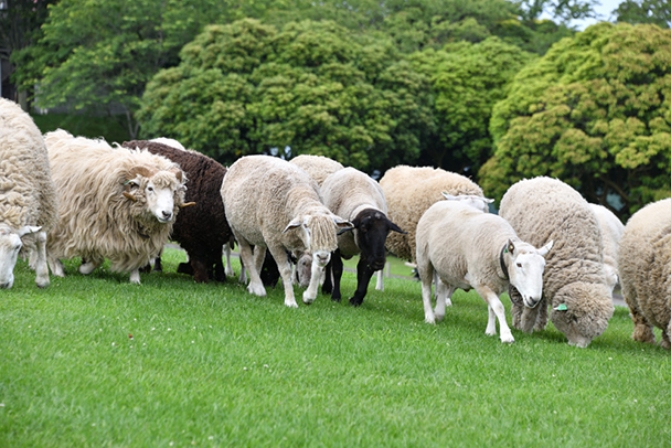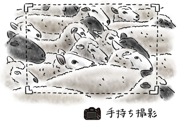 いろいろな種類のヒツジが混在していたため、できるだけ多くの種類が画角に入るアングルと構図で撮影しました。また、草を食べながら移動しているので、ヒツジが顔を上げた瞬間を狙っています。