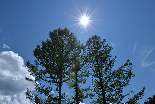 3本のカラマツがバランスよく揃っていたので、主役に据えてみました。アクセントとして雲を入れ変化をつけています。絞り値f/14、露出補正-0.7、焦点距離は広角側(24mm)に設定して撮影しました。