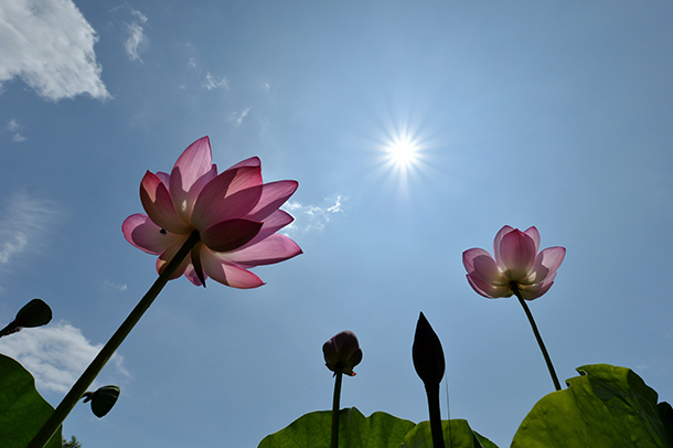 夏の代表的な花、ハスの花を低いカメラ位置から見上げます。太陽と開いている花、そして蕾のバランスを意識しています。透過光がハスの花弁のピンクを見せてくれました。焦点距離は20mmに設定しています。
