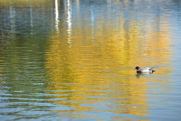 水面に写り込んだイチョウを撮影することで、黄葉している様子を想像してもらう方法です。ワンポイントとして水鳥が来るまで待って撮影しました。