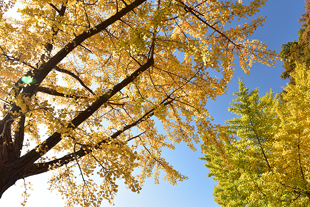 秋の快晴の青空と組み合わせたオーソドックスな撮り方ですが、逆光気味の光を使ってみました。左の枝を入れたイチョウを多めに入れ、木の強弱も考えています。