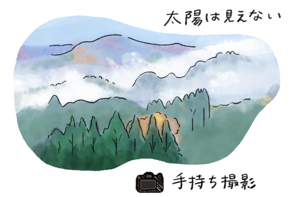 早朝の谷間には霧がかかり、まるで山水画を見ているようです。望遠レンズの圧縮効果によって連なる山の稜線は連続性が強調されています。近景の杉の木から奥へ続く山並みで、奥行きの感じも表現できました。カメラは手持ちにて撮影しました。