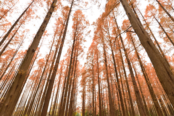 18mmの超広角レンズでの「遠近感の誇張」を意識して奥行き(高さ)を表現してみました。露出補正は思い切ったプラス補正(+2.7)にし、メタセコイアの紅葉の色を出しています。