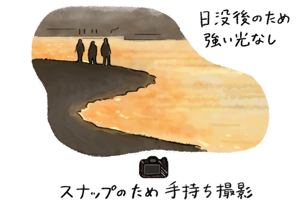 夕暮れの色づき始めた海岸線にちょうど3人組が歩いて来ました。海岸線の曲線とのバランスを考えて望遠レンズで切り取っています。日没後の、強い光がないタイミングに、カメラは手持ちにて撮影しました。