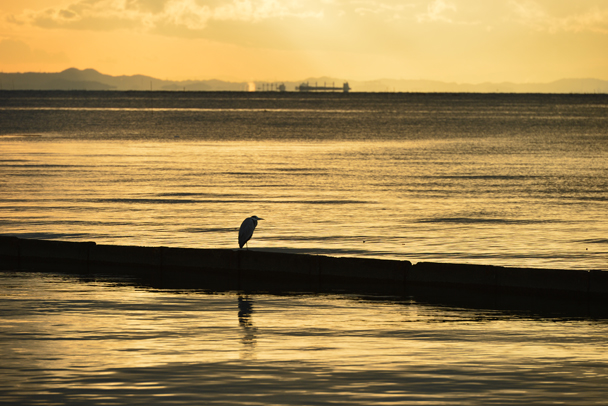 主役はサギのシルエットです。サギの向いている方を少し多めにするよう、画面のやや左側に配しています。奥の工場群を入れて画面の広がりや奥行き感を見せています。
