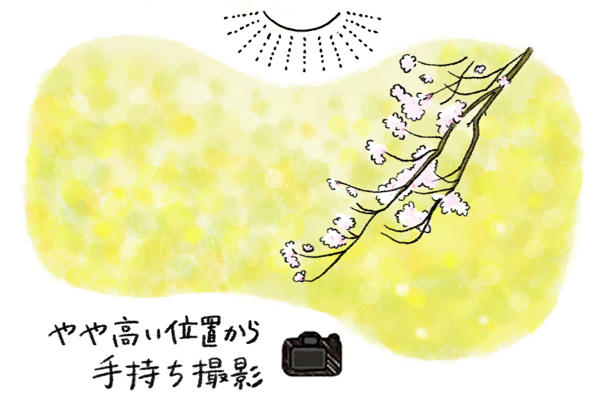 主役は一枝のサクラです。背景に菜の花の黄色を配して色の対比を考えました。菜の花が強くなりすぎないよう、ズームレンズの望遠側でボケ効果を使いました。一枝は画面の角辺りから出すとバランスがよくなります。やや高い位置からカメラを手持ちして撮影しています。