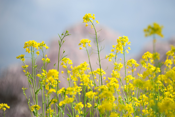 春の花といえばやはりサクラです。そして黄色い菜の花も同じ頃に咲き競います。主役脇役をそれぞれどちらにするか悩みますが、さまざまなバリエーションで撮ってみましょう。雨の日のしっとりした感じもいいでしょうが、快晴の元、忠実な色再現をしたい被写体です。