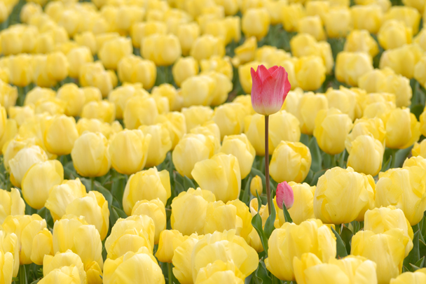 球根を埋める際に混入でもしてしまったのか、黄色いチューリップの中に1本だけ色の違うピンクのチューリップがありました。面白く目立っていましたから、間違いなくここの女王様なのでしょう。