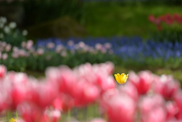 ボケのサンドイッチを狙いました。前ボケと後ろボケの間に、色の違うチューリップのところを探します。まさに春の色の競演です。主役は1本の黄色いチューリップ。色違いの横の線も意識しました。