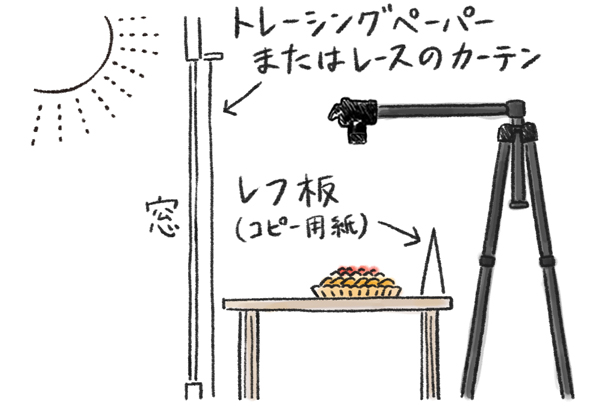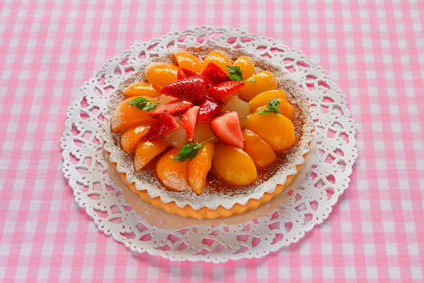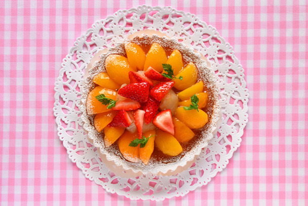 アプリコットとイチゴのタルトを窓際に置き、窓から入る光を効果的に使って撮影しました。タルト全体を画面に入れるのではなく、アップ気味に撮ることでタルトのディテールが見る人に伝わり、グラフィカルな作品に仕上げることができます。窓からの光を柔らかくするためにトレーシングペーパーやレースのカーテンを活用するとよいでしょう。
