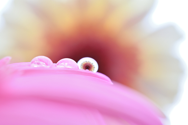 水滴を作った花の後ろに置いた別の白い花が、水滴に写り込むよう撮影してみました。楕円形など形が悪い水滴の場合、写り込む花がゆがんだりボケたりしてしまいます。水滴はできる限り円形になるよう作り、ライブビューに切り換えてピントを確認しながらシャッターを切りましょう。