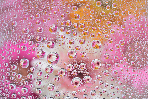 霧吹きで作った水滴越しに、水を張ったお皿に浮かべた花を撮影してみました。レンズと花の間に水平に配置したCDケースに水滴を作り、水滴に写り込んだ花にしっかりピントが合うようカメラは三脚で固定。ライブビューでピントを確認しながら撮影しています。