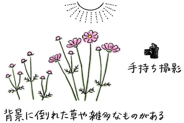 花のバランスのよさそうな一株を選んでみましたが、背景があまりきれいでない状況でした。このように背景をあまり見せたくない場合、望遠側で撮影することで大きめにぼかすのもひとつの方法です。また露出を思い切ってオーバーにして、ハイキー調にしてしまうと、より一層気にならなくなります。今回は花や茎の色が、ギリギリ残る程度のオーバーにしてみました。日中撮影のため、カメラは手持ちで撮っています。