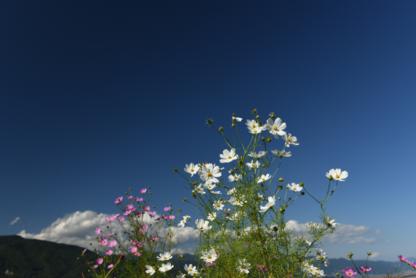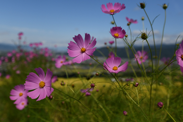 秋になったなあと感じさせてくれる被写体はたくさんありますが、そんな中でも風にそよぐ可憐なコスモスは、上位に入るのではないでしょうか。花だけを大きく捉えるだけではなく、周りの様子を取り込んで、「コスモスのある風景的」にまとめてみると素敵です。特に今回は、「背景」を考えながら作品作りをしてみました。