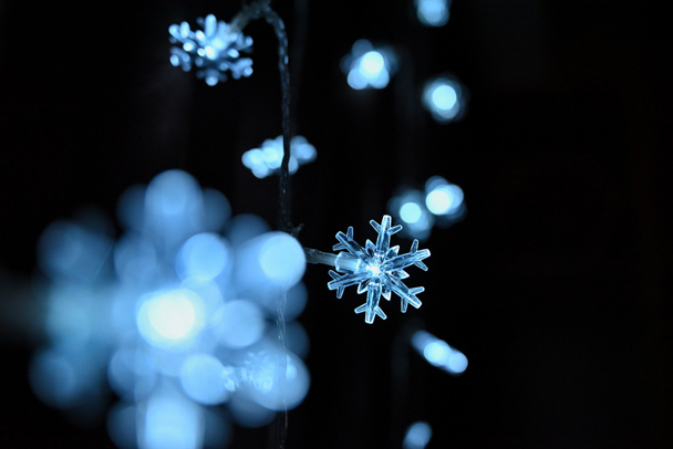 雪の結晶を模したLEDが連なるイルミネーションを撮影しました。青白い光が冷たさを演出してくれています。