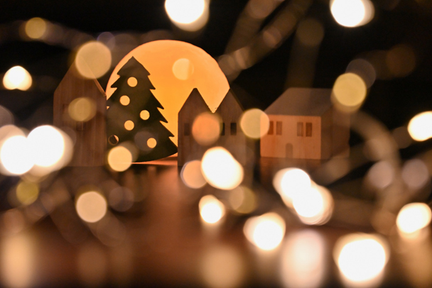 ミニチュアの家やツリーの背後に、満月をイメージするような丸い形の照明を配置しました。手前に小さなLEDの電球をランダムに置き、カメラを被写体に近づけて撮影をしています。絞りを開けることで、電球の光が大きくぼけて街中を飾る電飾のような雰囲気になり、クリスマスムードあふれる作品になります。