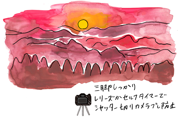 - 露出をマイナス(-1.3)にして、太陽の色が強くなりすぎないように注意
