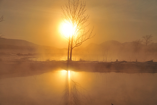 朝日の所に1本の木を重ねてみました。上下左右のシンメトリーを考え、安定感や静けさも意識しています。ホワイトバランスは「曇天」に設定し、少し赤味を増やしています。