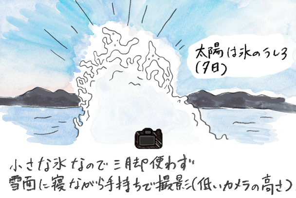 太陽が氷の後ろに落ちてきているタイミングです。小さな氷だったため、雪面に寝ながら低いカメラ位置をキープしつつ、手持ちで撮影しています。